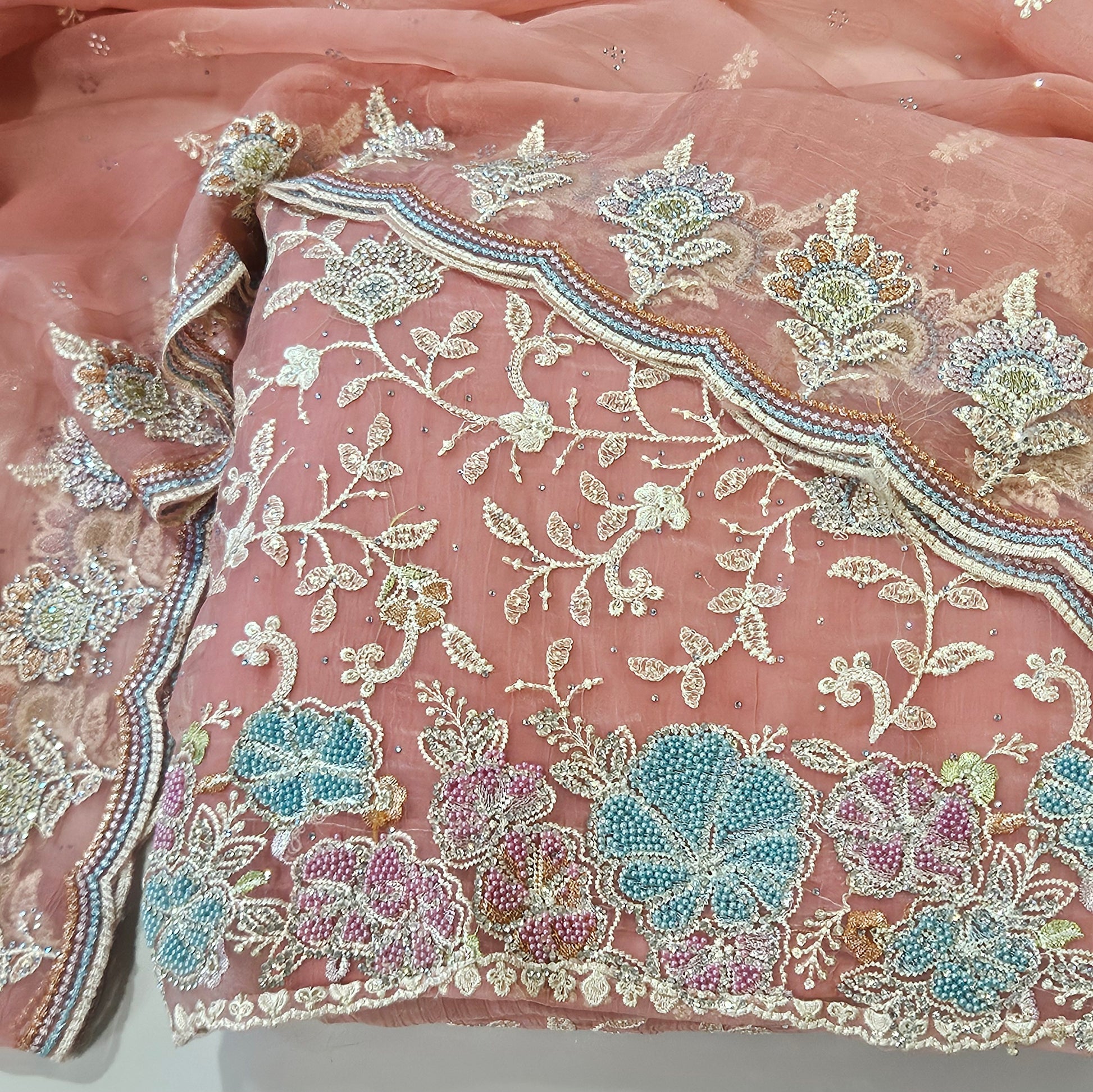 Top : Organza with Embroidery and pearl work Unstitched Salwar Suit
