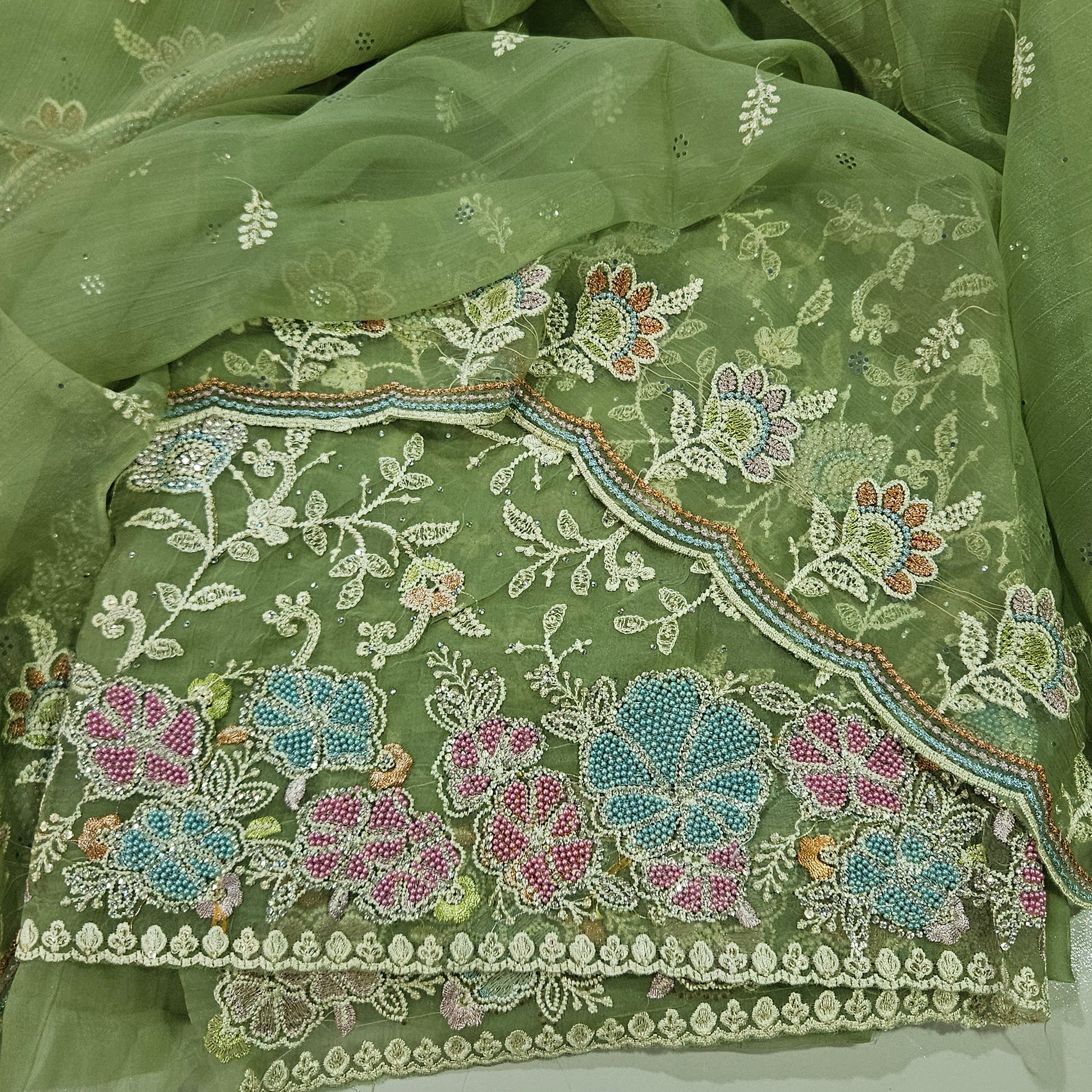 Top : Organza with Embroidery and pearl work Unstitched Salwar Suit